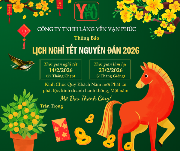 Nhân dịp Tết Nguyên Đán Bính Ngọ 2026, Công ty TNHH Làng Yến Vạn Phúc (Yvafu) xin trân trọng thông báo lịch nghỉ Tết như sau: